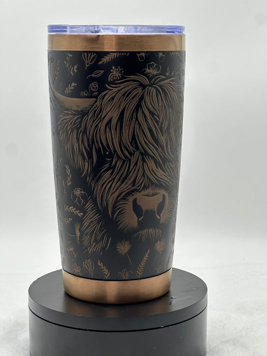 🥃 Highland Cow Laser-Engraved Tumbler – Black & Bronze Stainless Steel (20oz)