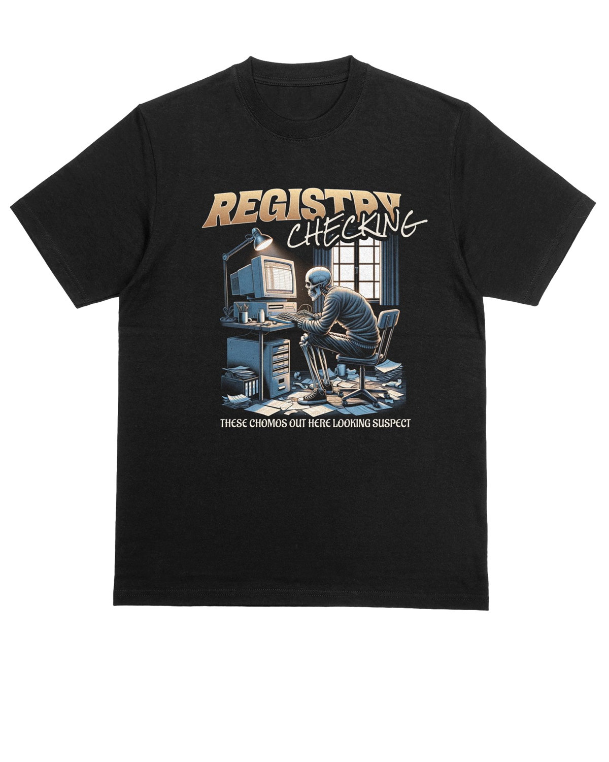 Bold, unapologetic, and 100% cotton. The “Registry Checking” tee from the No Chomo Collection delivers streetwise attitude with a clean fit and heavyweight feel. Designed for those who speak truth without flinching.